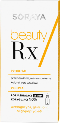 Позначок: Beauty RX, Soraya, Азелогліцин, вирівнює тон шкіри, Глутатіон, зволоження, Олігопептид-68, освітлює і зволожує шкіру, освітлююча сироватка, пігментація, пігментні плями, пігментована шкіра, сироватка для обличчя, чутлива шкіра